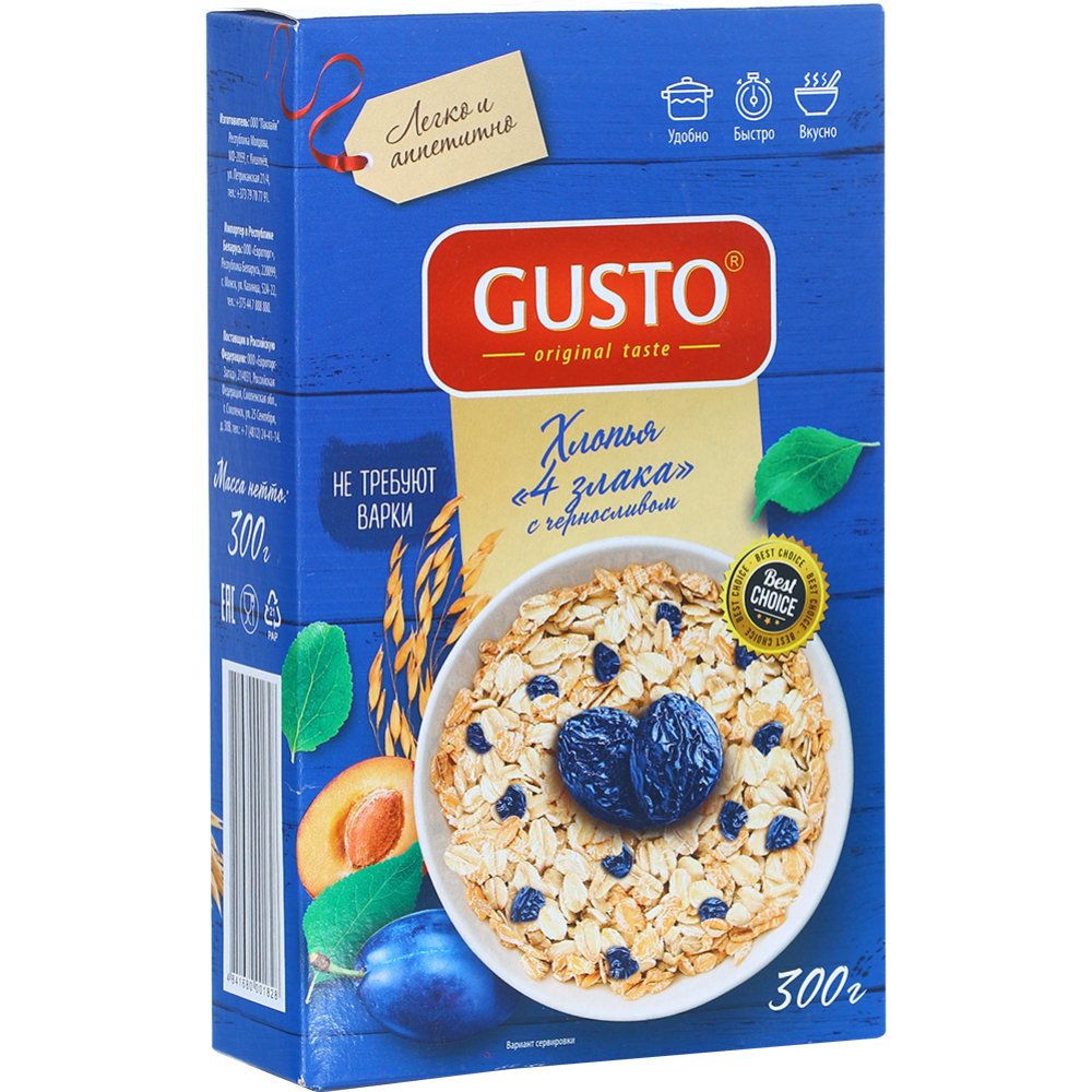 Хлопья 4 злака «Gusto» с черносливом, 300 г.
